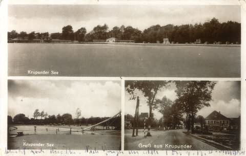 Krupunder, Altonaer Straße in der Teilansicht . . .... oben: Krupunder See; ... unten-links: Rutsche; ... unten-rechts: Krupunder Park, Altonaer Straße 325. Poststempel 6. Juli 1936.Herkunft:Sammlung Michael