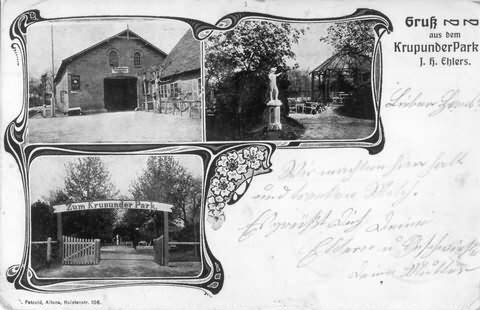 Altonaer Straße 325, Gastwirtschaft Krupunder Park J.H. Ehlers. 3 Teilansichten, oben-links: Gastwirtschaft; oben-rechts: Wirtschaftsgarten mit kleiner Statue; unten: Eingang zum Garten.Poststempel vom 13.7.1908; Herkunft:Sammlung Michael