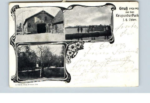 Altonaer Straße 325, Gastwirtschaft Krupunder Park J.H. Ehlers. 3 Teilansichten, oben-links: Gastwirtschaft, oben-rechts: Krupunder See.unten: Eingang zum Garten.Poststempel von 1913