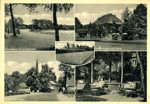 Altonaer Straße in den Teilansichten . . . ... oben-rechts: Altonaer Straße 325 "Krupunder Park"; ... unten-rechts:Krupunder, Altonaer Straße 325 Garten vom "Krupunder Hof"; Text hinten: Hotel Restaurant Cafe Besitzer Robert Hinz Tel. Pinneberg 4185 Halstenbek die Wiege des deutschen Waldes. Aufnahme nach 1956, Neubau von "Blumen-Heins in der Teilansicht unten-links ist bereits vorhanden. Herkunft:Sammlung Krohn