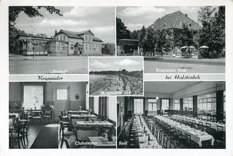 Krupunder, Altonaer Straße in den Teilansichten ... ... oben-links:Gaststätte "Seehof", Halstenbek, Altonaer Straße 350. ... unten-links:Clubzimmer im "Seehof", Halstenbek. ... oben-rechts;"Krupunder-Hof", Altonaer Straße 325, Rellingen. ... unten-rechts:Saal im "Krupunder Hof", Rellingen. ... Mitte:Krupunder See, Halstenbek. Text-hinten:Hotel, Restaurant Cafe "Seehof" - Krupunder Park" Bes. Robert Hinz, Tel Pinneberg 4281 u. 4185 und Hamburg 96 42 81. Der Neuzeit entsprechend behagliche Gasträume, sowie Saal mit Bühne für Vereins-, Betriebsfeiern, Hochzeitsgesellschaften uws. geeignet. Poststempel vom 18.4.1956 Herkunft:Sammlung Miller