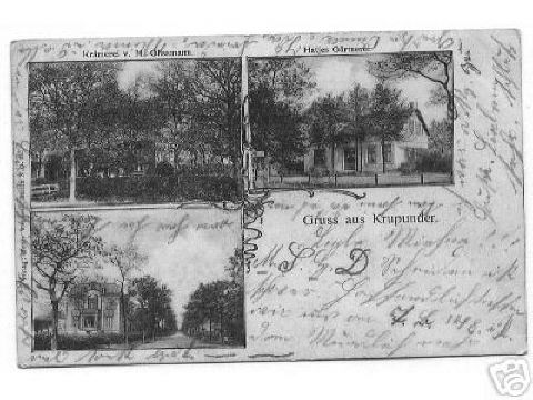 Krupunder, in der Teilansicht . . .... oben-links:Krämerei von M.Glissmann;... oben-rechts:Hatjes Gärtnerei;... unten-links: Chaussee?Gruss aus Krupunder.Poststempel vom 05.08.1904