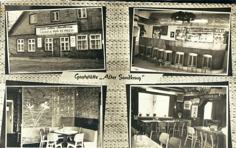 Halstenbek, Krupunder, Altonaer Straße, Gaststätte "Alter Sandkrug", Dieser Gasthof war über 200 Jahre im Besitz der Familie Krohn und lag ursprünglich auf Rellinger Gebiet und kam erst 1893 nach einer Grenzregulierung an Halstenbek. Auf das Anwesen wurden insgesamt 3 Brandanschläge verübt: 31. Mai 1964, 30.September 1964 sowie am 14.März 1966, der letzte endete mit dem Totalverlust. Herkunft:Sammlung Michael