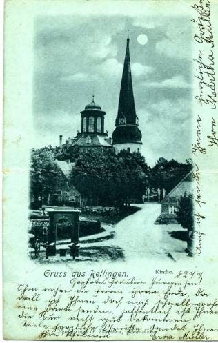 Am Markt Blick zur Kirche, das "Stoldt-Haus" hinter dem Pumpenportal besitzt auf der Giebelseite noch Fachwerk, somit dürfte das Aufnahmedatum um 1890 sein. Die Karte wurde als sogenannte "Mondscheinkarte" gestaltet. Poststempel 1899. Herkunft:Sammlung Hoyer