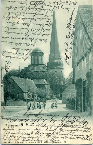 Am Markt Blick von “Schmidt's Weinstuben” auf Kirche und “Zimmerei Stoldt”. Stempel Rellingen 13.3.1902 Stempel Orleans 14.3.1902 Text Anschriftenseite Herrn Ernst Pein pr. Adr. Grand Cafe’ des Tourelles in OrleansFrankreich Text Bildseite: Unten: 13.3.02 Lieber Ernst habe deine Karte erhalten, meinen besten Dank. Wie geht es dir noch ??? in Orleans? Mir geht-s noch immer gut. In 3 Wochen bin ich in Rellingen, wo die Mädels auf den Bäumen wachsen. Unten kopfstehend. Besten Gruß sendet ebenfalls Martha Wördemann Karte folgt in den nächsten Tagen Rechts senkrecht: Herzl. Gruß Dora Wördemann m. Weitje ??? Wördemann Oben Kopf stehend: Hier in Rellingen ist’s noch immer beim Alten. Grüße bitte Deinen Vetter Wilhelm von mir und sage ihm, er möchte auch ??? bald mal wieder schreiben. Sein guter Baumschularbeiter hat sich auch verheiratet und bewohnt jetzt die Villa Franz ??? thal??? am Ehmschen. Mit Gruß dein Freund Wilhelm. Links senkrecht: Gruß unleserlich Poststempel vom 13.3.1902
