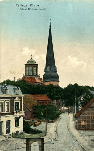 Am Markt Kirche vom "Fischhaus", Am Markt 10, aus gesehen. Im linken Laden von Haus 11 ist als Übergang bis zur Eröffnung der "Kaiserlichen Post" in der Poststraße 9 im Jahr 1903, die Post untergebracht, das entsprechende Türschild hängt über der Tür. Im rechten Teil hat “Schneidermeister Bernhard Schröder” (Betten-Schröder) sein 1. Geschäft, die Wohnung befindet sich im Souterrain unter der Schneiderei. Dahinter “Zimmerer Stoldt”, gegenüber der “Hof Kröger”. Der Kartentext "1754 von Sonnin" ist nicht korrekt, Cai Dose war der Erbauer. Herkunft:Sammlung Hoyer