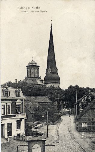 Am Markt Kirche vom "Fischhaus", Am Markt 10, aus gesehen. Im linken Laden von Haus 11 ist als Übergang bis zur Eröffnung der "Kaiserlichen Post" in der Poststraße 9, die Post untergebracht, das entsprechende Türschild hängt über der Tür. Im rechten Teil hat “Schneidermeister Bernhard Schröder” (Betten-Schröder) sein 1. Geschäft, die Wohnung befindet sich im Souterrain unter der Schneiderei. Dahinter “Zimmerer Stoldt”, gegenüber der “Hof Kröger”. Der Kartentext "1754 von Sonnin" ist nicht korrekt, Cai Dose war der Erbauer. Herkunft:Sammlung Miller
