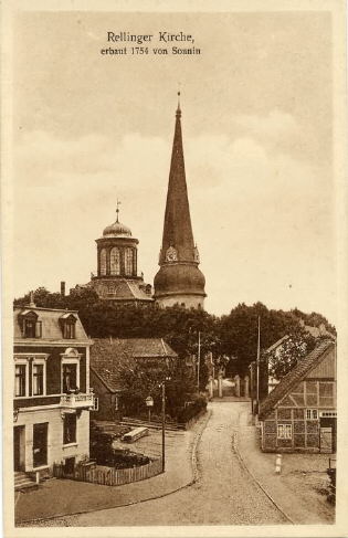 Am Markt Kirche vom "Fischhaus", Am Markt 10, aus gesehen. Im linken Laden von Haus 11 ist als Übergang bis zur Eröffnung der "Kaiserlichen Post" in der Poststraße 9, die Post untergebracht, das entsprechende Türschild hängt über der Tür. Im rechten Teil hat “Schneidermeister Bernhard Schröder” (Betten-Schröder) sein 1. Geschäft, die Wohnung befindet sich im Souterrain unter der Schneiderei. Dahinter “Zimmermeister Stoldt”, gegenüber der Hof und Gastwirtschaft Kröger. Der Kartentext "1754 von Sonnin" ist nicht korrekt, Cai Dose war der Erbauer. Herkunft:Sammlung Schiewe > Heimatverein Rellingen
