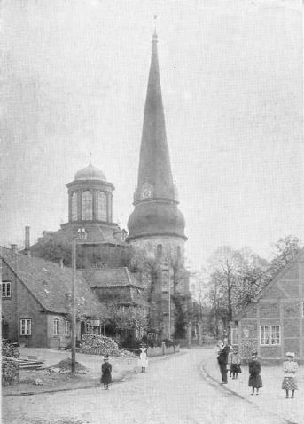 Am MarktBlick zur Kirche mit "Stoldt-Haus" und “Hof und Wirtschaft Kröger”. dasselbe Motiv wurde auch als Klappkarte gedruckt.Herkunft:Sammlung Miller