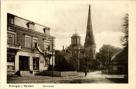 Am MarktBlick zur Kirche, links das Haus Nr.11 mit “Frisör Hermann Bornholdt” und “Kaufmann Anton Harringa”; dahinter das "Stoldt-Haus", gegenüber "Hof und Wirtschaft Kröger"Herkunft:Sammlung Schleyer