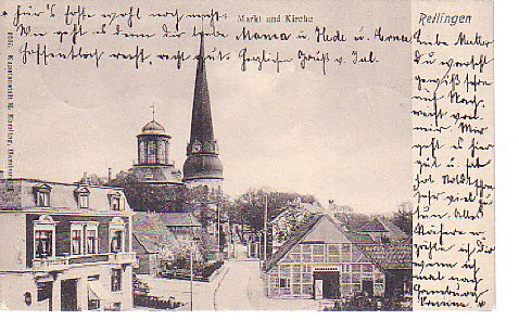 Am MarktBlick auf die Kirche; links Haus-Nr.11, daneben das "Stoldt-Haus", gegenüber "Bäcker-Meyer" und "Hof und Wirtschaft Kröger".