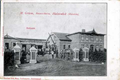 Baumschule Martin Griem Altonaer Straße 139, 139a, 141 vor dem Ausbau der B5 zur A23, anschließend Ahornstraße 17 Der "Griemsche Hof". Zusatzinformationen Kartentext: "M.Griem Baumschulen, Halstenbek (Holstein) Hofraum" steht auf der Kartenvorderseite. Das Wohnhauses stand bis 2005 noch als Ruine unmittelbar an der A23. Weitere Informationen zu der Familie Martin Griem finden Sie im Internet unter www.scharnberg.homepage.t-online.de . Diese Karte wurde von Martin Griems Tochter Agnes, an ihren Opa Ruge aus Thesdorf geschrieben Poststempel vom 5.6.1906. Herkunft:Sammlung Hoyer