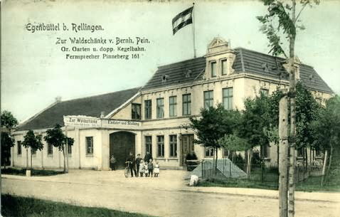 Egenbüttel, Pinneberger Straße 15, "Zur Waldschänke", Bernhard Pein. Das Haus steht 2006 noch, ist aber von hohen Bäumen verdeckt kaum von der Straße zu sehen. Die Durchfahrt wurde abgebrochen, die beiden Dacherker entfernt. Poststempel vom 25.7.1900. Herkunft:Sammlung H.Hoyer