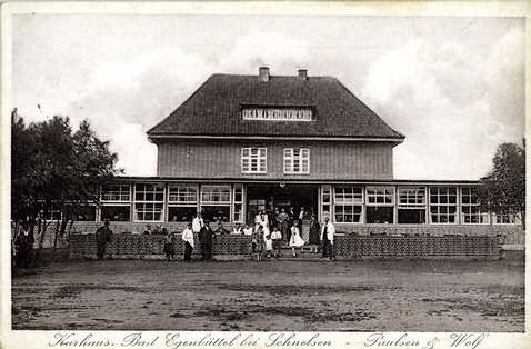 Am Moorbad, Kurhaus Bad Egenbüttel; Text vorn: Kurhaus Bad Egenbüttel bei Schnelsen Paulsen & Wolf; Text hinten: Kurhaus Bad Egenbüttel Telefon D. 7 Niendorf 2777 Tanzdielee - Autopark; F.Pressler, Altona, Friedrichstr. 67; Poststempel 17.3.1930, Herkunft:Sammlung Miller