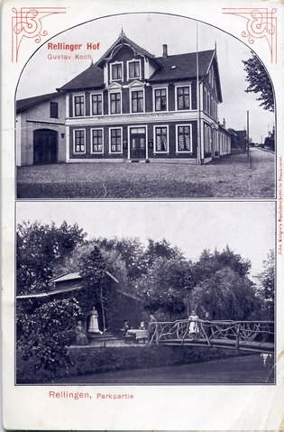Ehmschen 1,Teilansicht oben: "Rellinger-Hof", Gustav Koch; Teilansicht-unten: Parkpartie mit Brücke über die Mühlenau; 2006 befindet sich an dieser Stelle die A23-Autobahn Ein- und Ausfahrt "Pinneberg-Mitte".Herkunft:Sammlung Miller