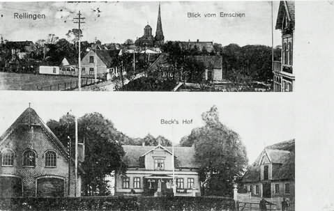 Ehmschen in der Teilansicht . . .... oben:Kirche vom Ehmschen aus gesehen; links Haus-Nr.10 "Maler-Schleyer", davon gegenüber Haus-Nr.5 "Wilkens". Im Vordergrund rechts ein Teil von Haus-Nr. 13, "Wördemann"