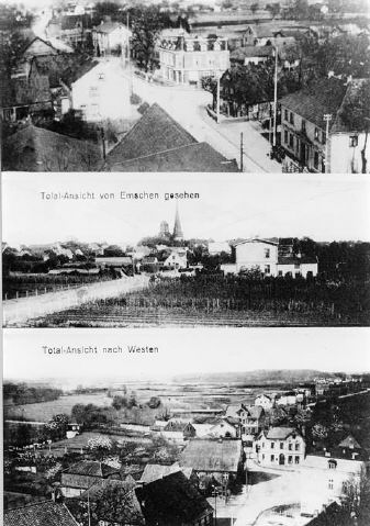 Ehmschen in der Teilansicht . . .... Mitte:Kirche vom Ehmschen aus gesehen; unterhalb der Kirche Ehmschen Nr.10 "Maler-Schleyer"; davor ein für Baumschulen typischer Erdschuppen. Rechts Ehmschen Nr. 13. Herkunft:Heimatverein Rellingen