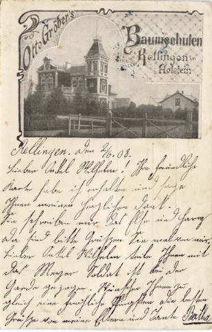 Ehmschen 33Baumschule Otto Gröber, > Baumschule Jonny Rechter > Glaser Melzer.Das Gebäude war lange Jahre nach der Kirche das höchste Gebäude in Rellingen! Poststempel vom 3.6.1908Herkunft:Heimatverein Rellingen