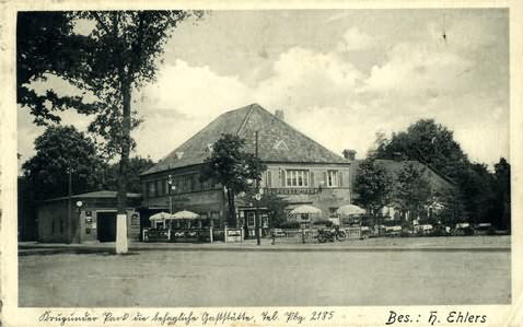 Fahne/Banner Krupunder, Altonaer Straße 325 Gasttätte "Krupunder Park; Die Fahne aus dem III. Reich flattert neben dem Eingang. Text an der Unterkante in Sütterlin "Krupunder Park - die behagliche Gaststätte - Tel. Pbg. 2185." Aufnahme um 1935. Herkunft:Sammlung Krohn