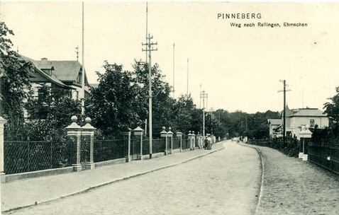 Falsche Bezeichnung "Pinneberg" anstatt "Rellingen". Der Ehmschen/ Oberer Ehmschen gehörte immer zu Rellingen. Links die um 1900 von Christian Oelting errichteten Villen mit den Haus-Nr. 83 bis 95. Rechts die Häuser 102, 104 (noch mit einem kleinen Turm) und 106. Aufnahme nach 1905, die Häuser sind bereits elektrifiziert. Herkunft:Stadtmuseum Pinneberg
