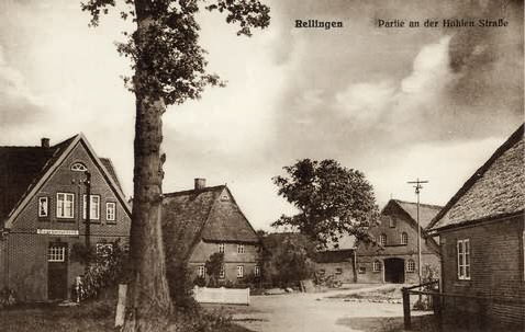 Friedenstraße Partie an der Hohlenstraße an der Kreuzung Jahnstraße, Hohlestraße und Friedenstraße. Rechts die Wirtschaft “Turnerheim”, anschließend “Hof Schaller” und “Altenteil Ohrt”, ganz links “Milchmann Hatje”. Aufnahme um 1924. 2005 steht noch das "Turnerheim". Herkunft:Sammlung Miller