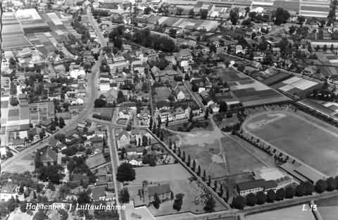HallstraßeLuftaufnahme von Halstenbek und Rellingen. Am oberen Bildrand die Altonaer Straße vor dem Ausbau zur B5-Schnellstraße /A23 mit der abzweigenden Hallstraße.Aufnahme nach 1953 und vor 1963.Herkunft:Sammlung Miller