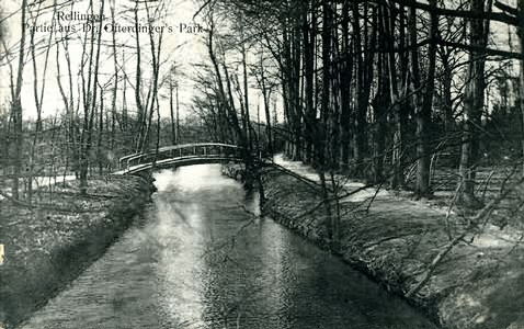 Hauptstraße 17 Park Dr. Ofterdinger, Blick von der Mühlenaubrücke- Hauptstraße in den Park. Die Mühlenau fließt in Richtung Pinneberg. Von den ehemals zwei Brücken ist seit vielen Jahren nur noch das Fundament auf der rechten Seite vorhanden. Poststempel von 1914. Herkunft:Sammlung Miller