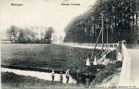 Hauptstraße Mühlenaubrücke Hauptstraße/ Stawedder, rechts Park Dr. Ofterdinger mit der Lindenallee. Das tiefgelegene Gelände links an der Mühlenau wurde nach 1945 durch Müll aufgefüllt und bebaut. Heute zweigt hier die Straße “Korkwisch” ab. Poststempel 11.9.1907 Herkunft:Sammlung Miller