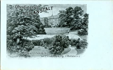 Hauptstraße 17Dr. Ofterdinger, Heilanstalt, 3 Teilansichten von dem Anstaltsgebäude und Park; Text vorn: Dr. Ofterdingers Heilanstalt Rellingen bei Pinneberg (Holstein)Herkunft:Sammlung Miller