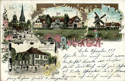 Hauptstraße in der Teilansicht . . . ... oben-mitte: Der "Beck-Hof" mit Brunnen und Statue an der Hauptstraße in Höhe "Am Rathausplatz"; Abriß der beiden Stallgebäude um 1920, Abriß des Wohnhauses 1983/84 bei der Gestaltung vom neuen Rellinger Ortskern. Auf dem Areal des "Arkadenhofs" hatte vorher die Baumschule Rudof Schmidt ihr Domizil bevor der Hauptsitz nach Halstenbek verlegt wurde; ... unten-links: Haus-Nr.42, "Gastwirtschaft zur Post" Poststempel vom 29.10.1898, damit älteste AK mit Rellingen als Absendeort. Herkunft:Sammlung Miller