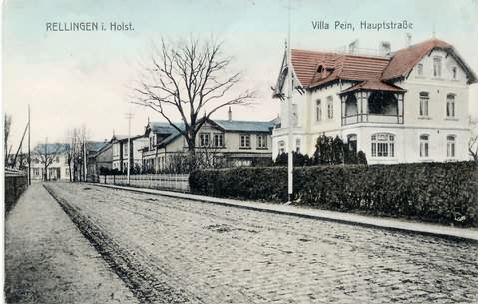 Hauptstraße 72 - 80 Blick auf Haus-Nr.72,"Villa Pein" in Richtung Tangstedter Chaussee, anschließend Nr.74, Zigarrenfabrik Simon Pein & Söhne, Nr.76 Betten-Schröder sowie Nr.78 "Bäcker-Hoffmann". Im Hintergrund Nr.80, "Gastwirtschaft-Mähl" > Kreissparkasse > Schuhhaus Tritschoks. Herkunft:Gemeinde Rellingen