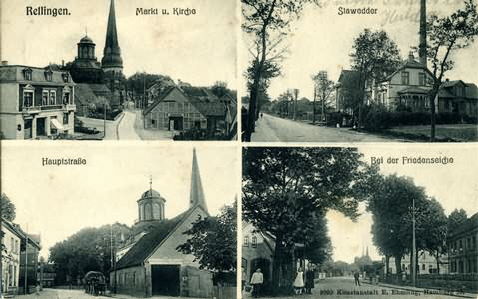 Hauptstraße in den Teilansichten. . . ... unten-links: Hauptstraße 31 mit Blick zur Kirche, noch mit alter Wagendurchfahrt; ... unten-rechts: Hauptstraße in Höhe Einmündung Tangstedter Chaussee, links alte Feuerwache, rechts Einmündung Friedenstraße mit dahinterliegendem Hof Wulf, abgebrannt 1912. Herkunft:Sammlung H.Hoyer