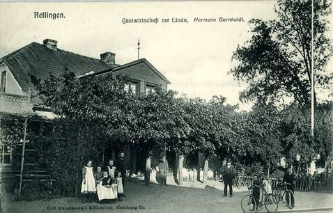 Hauptstraße 50 Gastwirtschaft "Zur Linde" von Hermann Bornholdt. Das Gebäude weist den gleichen Baustil wie das alte Rathaus, spätere Bücherei, auf. Der Wirtschaftsbetrieb wurde 1968 eingestellt. Später entsteht hier der "moderne" Flachdachbau mit den Geschäften im Erdgeschoß.