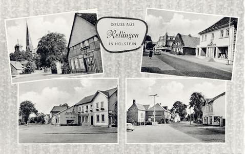 Hauptstraße in den Teilansichten . . . ... oben-rechts:Haus-Nr.42, "Pott-Meyer" und Kreuzung Hamburger Straße; ... unten-links:Haus-Nr.80, Kreissparkasse, "Uhren-Neuhoff" ; ... unten-rechts: Hauptstraße/ Ecke Tangstedter Chaussee, Blick Richtung Kirche, links Haus-Nr.78, "Bäcker-Hoffmann", dahinter Haus-Nr.74, Simon Pein & Söhne, gegenüber Haus-Nr.63, "Papierwaren-Kunkel" > Papier & Stift Herkunft:Sammlung Miller