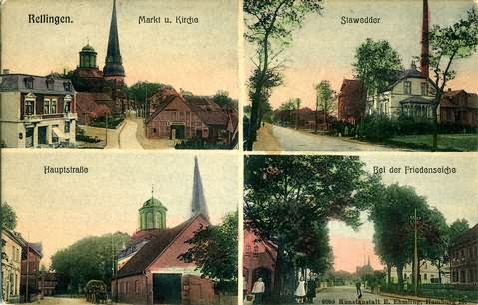 Kirche in der Teilansicht . . . ... oben-links: Am_Markt mit Blick zur Kirche; ... unten-links: Hauptstraße, Blick von der Ecke Hamburger Straße nach Süden zur Kirche; links Haus 42 "Pott-Meyer"; im Hintergrund Haus-Nr.25 Altes Gasthaus; rechts Haus Nr.31 "Rellinger Hof", dahinter die Kirche. Poststempel vom 1.1.1908. Herkunft:Sammlung Krohn.