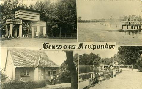 Krupunder, Altonaer Straße in der Teilansicht . . . ... oben-links: Eingang zum Strandbad, ... oben-rechts: Krupunder See; ... unten-links: Geschäft, dasselbe Motiv wird auf einer anderen Karte als "Lebensmittel August Wolff" bezeichnet; unten-rechts: Krupunder See. Aufnahme um 1946. Herkunft:Sammlung Miller