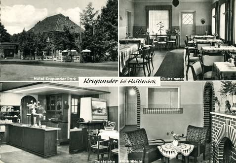 Krupunder, Altonaer Straße 325, Altonaer Straße, Hotel Krupunder Park, 4 Teilansichten: Außenansicht und 3 Innenansichten, Text vorn: Hotel Krupunder Park, Clubzimmer, Gaststube, Hotel Diele. Weiterführende Informationen Text hinten: Hotel, Restaurant, Cafe Krupunder Park Bes. Robert Hinz Hamburg- Eidelstedt, Bundesstraße 5 Tel. Pinneberg 41 85 und Hamburg 96 41 85 Der Neuzeit entsprechend behagliche Gasträume sowie Saal mit Bühne. Für Vereins-, Betriebsfeiern, Hochzeitsgesellschaften usw. geeignet, W.Bindseil & Sohn, Hamburg 22, Heinrich- Hertz- Str.1, Tel. 22 19 66, Nr.4742 Herkunft:Sammlung Miller