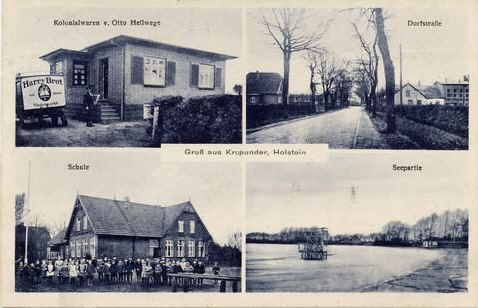 Krupunder, Altonaer Straße 4 Teilansichten: oben-links: Außenansicht Kolonialwaren v.Otto Hellwege; oben-rechts: Dorfstraße ?; unten-links: Altonaer Straße 303, die alte Schule; unten-rechts: Krupunder See mit Sprungturm. Text vorn: Gruß aus Krupunder, Holstein, 1)Kolonialwaren v.Otto Hellwege, (2)Dorfstraße, (3)Schule, (4)Seepartie; Text hinten: Y5747 30; Poststempel 4.6.1934; Herkunft:Sammlung Miller