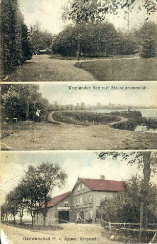 Krupunder, Altonaer Straße 299; Gastwirtschaft "Krupunder Hof", H. von Appen, später Georg von Appen, davor H. Neels. Um 2000 befindet sich in den Gebäuden ein Schwimmbadbau. 3 Teilansichten, oben: Gehölz (am See?): mitte: Krupunder See mit Strandpromenade; unten: Gastwirtschaft H. von Appen. Poststempel 25.April 1923. Herkunft:Sammlung Michael
