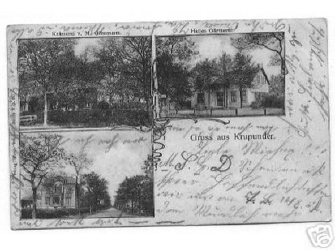 Krupunder, in der Teilansicht . . .... oben-links:Krämerei von M.Glissmann;... oben-rechts:Hatjes Gärtnerei;... unten-links: Chaussee?Gruss aus Krupunder.Poststempel vom 05.08.1904