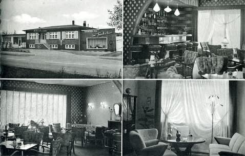 Krupunder, Altonaer Straße 357, 4 Teilansichten vom Hotel "Fuchsbau", Altonaer Str. 357. In der Außenansicht ist ganz links die Tankstelle (DEA, Deutsche Erdöl Aktiengesellschaft?) zu erkennen. Text hinten: Fuchsbau Weinrestaurant und Hotel, Bes. Frau Else Ranz - Rellingen - Krupuder Altonaer Str. 357, Tel. Pinneberg 4603. Aiufnahme um 1965? Herkunft:Sammlung Miller