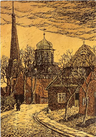 KünstlerkarteRellinger Kirche gemalt von Bernhard Troch, als Vorlage diente die Postkarte arel0134. Rechts Haus Nr. 20, dahinter Haus 26 "Blumen-Heins".Herkunft:Sammlung Miller