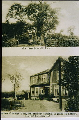 Naturdenkmal, Egenbüttel, Hohle Eiche, gegenüber Haus 2, Die 1000jährige Eiche ist als Naturdenkmal des Kreis Pinneberg wie folgt eingetragen: 11/02 Stieleiche (Quercus robur) 1 Stück Rellingen, Hohle Eiche, vor dem Haus Nr. 2 an der Straße. Rellingen, Egenbüttel, Pinneberger Straße 47/ Ecke Hohle Eiche. Obere-Teilansicht: Text: "Über 1000 Jahre alte Eiche". In der hohlen Eiche stehen 4 Kinder. Herkunft:Heimatverein Rellingen