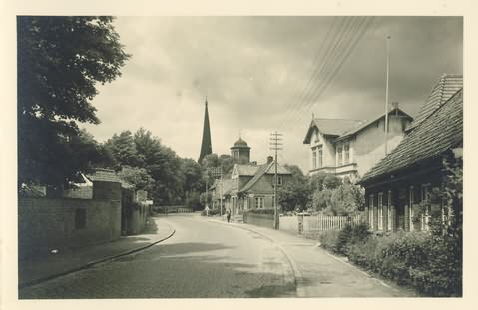 Hauptstraße 17, Park Dr. OfterdingerBlick auf die Kirche von der Hauptstraße Nr. 12, links die Umfassungsmauer von Nr. 17 “Landhaus Martens”. Aufnahme vor 1945.Herkunft:Heimatverein Rellingen