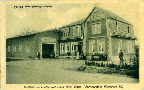 Pinneberger Straße 47, Egenbüttel, "Gasthof zur hohlen Eiche von Ernst Timm" und "Gruss aus Eggenbüttel" so heißt es auf der Kartenvorderseite. Eggenbüttel anstatt Egenbüttel ist natürlich falsch. Verlag:Hermann Möller Rellingen. Poststempel auf einer Reichspost Germaniamarke unleserlich. Herkunft:Sammlung Miller