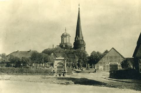 Pumpenbogen, Am Markt Blick über den Pumpenbogen zur Kirche. Links das "Stoldt-Haus" mit Nebengebäuden, gegenüber "Hof-Kröger" und ganz rechts "Schmidts Weinstuben. Das Haus Nr.11 ist noch nicht gebaut. In dem Buch "Rellingen-Archivbilder" steht unter diesem Foto: Diese Karte stammt von etwa 1890 und ist eine der ältesten und schönsten Aufnahmen mit Blick über den Alten Marktplatz auf die Kirche. Außerordentlich reizvoll stellt sich das Pumpenportal dar, in Besitz genommen von spielenden Mädchen mit ihren Puppen. Sommerliche Wärme und dörfliche Idylle strömt auf den Betrachter ein. Aufnahmedatum um 1890. Herkunft:Sammlung Miller