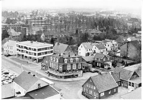 Ratsweg Blick von der Kirchenlaterne. Die Häuser vom Ratsweg sind hinter dem "modernen" zweigeschossigem Geschäftshaus von "Schlachter-Bornhold”, Hauptstraße 50, zu sehen. Karte aus dem Kalender ”Der Kreis Pinneberg Kalender 1976” von H.Lorenz Herkunft:Sammlung Miller
