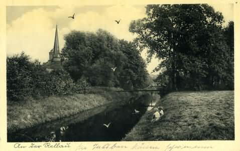 Rellau-Mühlenau Blick von der Thesdorfer Brücke in Richtung Kirche. Im Hintergrund verbinden 2 private Brücken von Bauer Kröger, Am Markt 3 und Hagdorn, Am Markt 6, die auf der Thesdorfer Seite liegenden Ländereien. Private Brücken waren nur für die Zeit der landwirtschaftlichen Nutzung zugelassen. Die Brücke von Am Markt-Nr.6, Hagedorn wurde nie ganz fertig, wurde abgerissen. Herkunft:Sammlung Nönchen