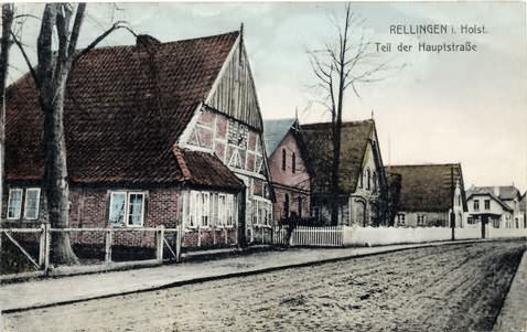 "Schatzkammer-Karte" Hauptstraße, jetzt “Am Rathausplatz”. Blick vom jetzigen Rathaus in Richtung Friedenstraße. Bis auf das letzte Gebäude Hauptstraße 51, ehemals Altenteilerhaus vom “Hof Wulf” > “Sanitär-Eggers”, sind sämtliche Gebäude abgebrochen. Poststempel 13.7.1912. Herkunft:Heimatverein Rellingen